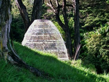 Nic Moon graduated with an MFA from RMIT University Melbourne in 2002 and a BFA Canterbury University 1990. Nic Moons work employs developments of the modern industrial age. Moon was awarded the 2007 Temporary Sculpture commission at Connells Bay and made six delicate shelter structures designed to protect and nurture native seedlings which referenced the regeneration of native bush currently being undertaken at Connells Bay. These structures, threaded with fishing net over stainless steel frames to reference Maori cloaks and Victorian hooped skirts, were adorned with fishing lures, seashells, shearing combs, sheep dog whistles, fleeces and bullets and acknowledged the people who had been before and their survival within the ecosystems of Connells Bay.